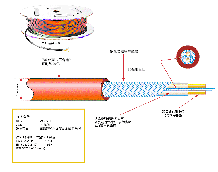5.0±10%毫米直徑的雙導電地熱線-新型發熱電纜,可滿足5毫米-100毫米不同覆蓋厚度設計