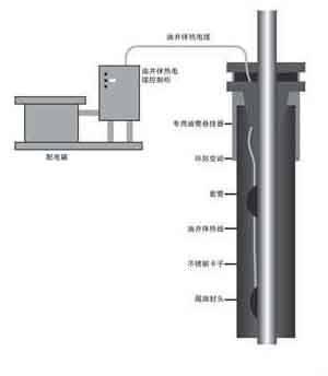 自控溫油井拌熱電纜電加熱裝置,是自控溫油井拌熱電纜通電后、沿管線方向,隨著井深的溫度梯度逆向自動調整輸出功率。通過油管外壁向油管內供熱,沿線向維持一定恒溫,以達到降粘、解錯、增加泵效之效果。其核心是伴熱電纜內三組PTC發熱芯帶是由導電高分子聚合物PTC功能材料,經擠出輻射加工制成,每一點皆能隨被加熱體系溫度的變化其輸出功率逆向隨之變化,以達到自動補償、自動調整、自動控制之功效。